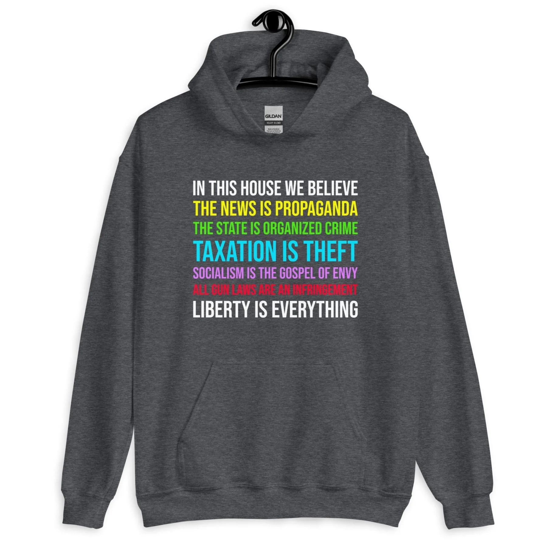 In this house we believe: the news is propaganda, the state is organized crime, taxation is theft, socialism is the gospel of envy, all gun laws are an infringement, liberty is everything